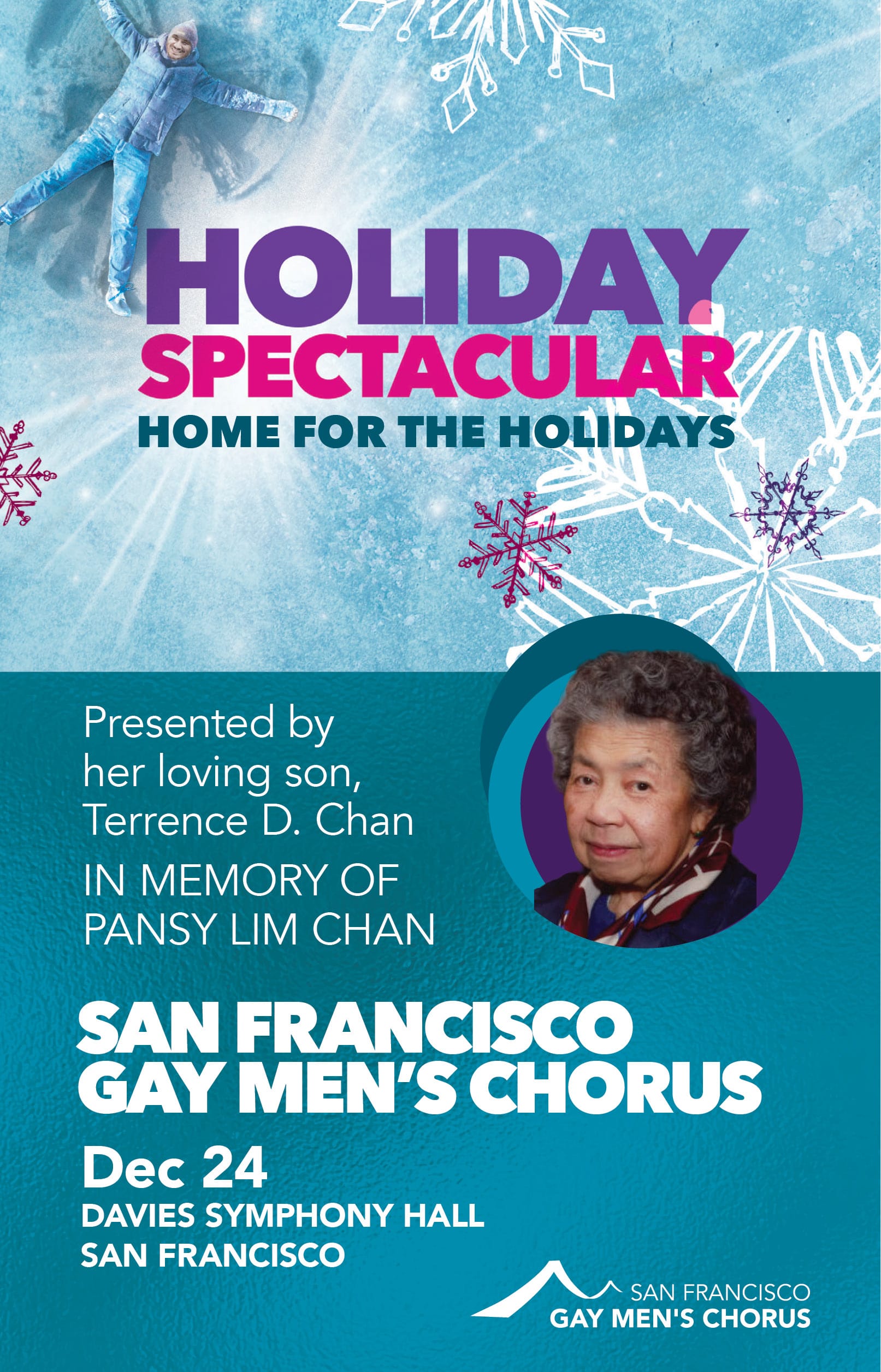 Thank you for making the San Francisco Gay Men’s Chorus part of your holiday tradition. As the days grow shorter, we gather this December to make our own light. Whether it be through laughter, harmony, or a sense of community, we persist in discovering our own way to shine! Whether this is your first time with us or your forty-seventh, welcome home.