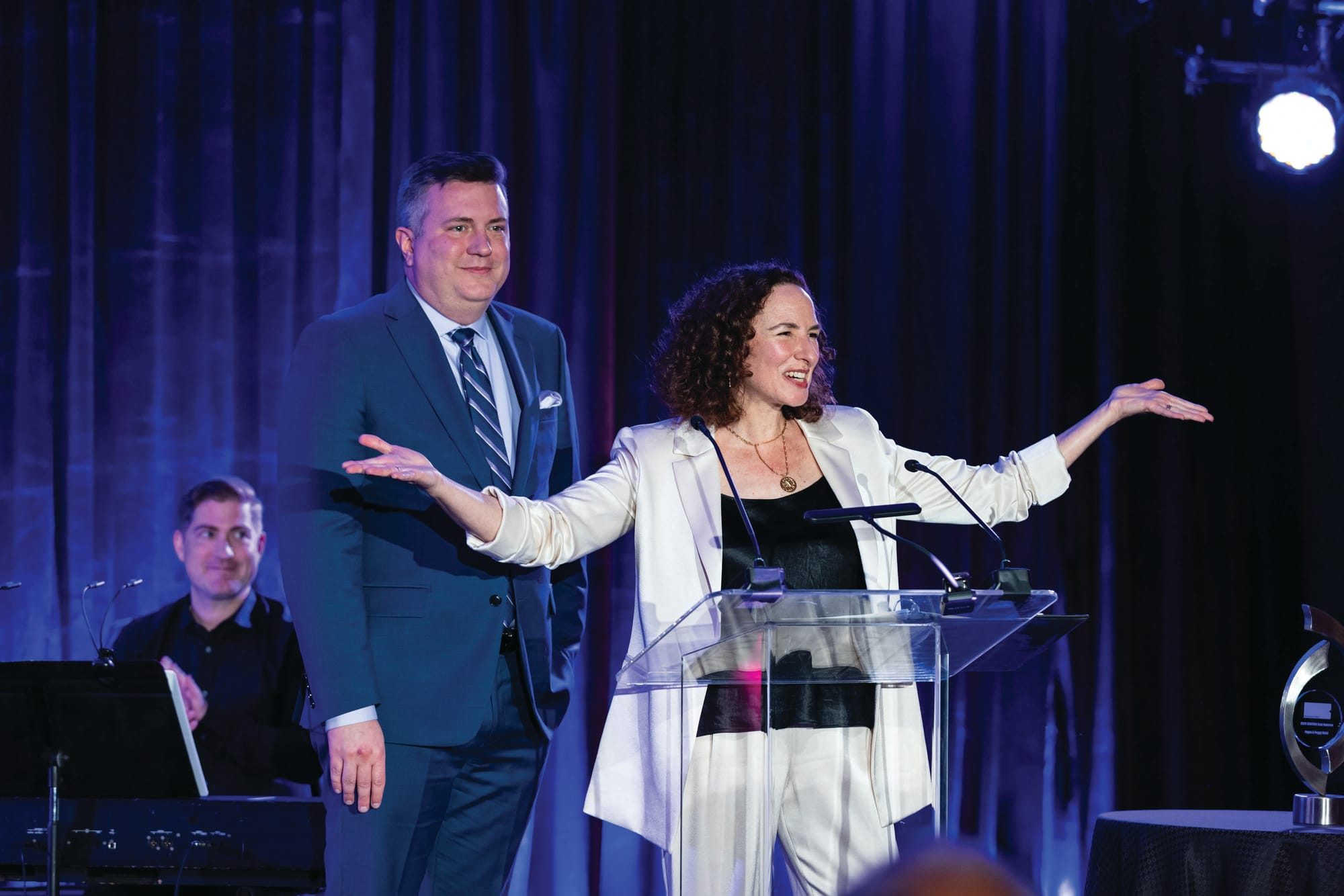 On April 13, 2024, Berkeley Rep held our annual OVATION Gala at the Ritz-Carlton, San Francisco to celebrate the power of live storytelling and musical theatre. This year, we honored Tony-award-winning director Michael Mayer and philanthropists Yogen and Peggy Dalal for their many contributions to the American Theatre. Co-chaired by Jill Fugaro and Sudha Pennathur, the event was a resounding success, raising over $800,000 for Berkeley Rep’s artistic, education, and community programs — and featured performances that brought the house down by Berkeley Rep favorites John Gallagher, Jr., Raúl Esparza, and more. We extend our sincerest thanks to Gold Sponsors Robin and Rich Edwards, Jill and Steve Fugaro, Bruce Golden and Michelle Mercer, Marcia Grand, Daniel F. Goodman, the Strauch Kulhanjian Family, and Gail and Arne Wagner, along with all of our Silver and Bronze Sponsors for their dedication to the vibrant future of live theatre in the Bay Area and beyond.