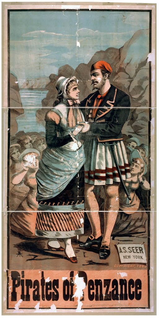 The Pirates of Penzance was the fifth of the fourteen Gilbert and Sullivan collaborations, and by this point the pair had figured out how to activate their wonder-twin powers and find their sweet spot. It happens when Sullivan’s music adds to Gilbert’s words, kicks them into the next dimension. Yes, Gilbert wrote Mabel a good line for when she offers Frederic her love: “Poor, wandering one! / If such poor love as mine / Can help thee find / True peace of mind, / Why, take it, it is thine!” But that line wouldn’t be nearly so memorable without the catchy waltz tune Sullivan invented for it, which automatically underlines the significant words while flirting and dancing with the lad. Words, music, and drama all in sync—that’s the sweet spot, and they nailed it in song after song, show after show.
