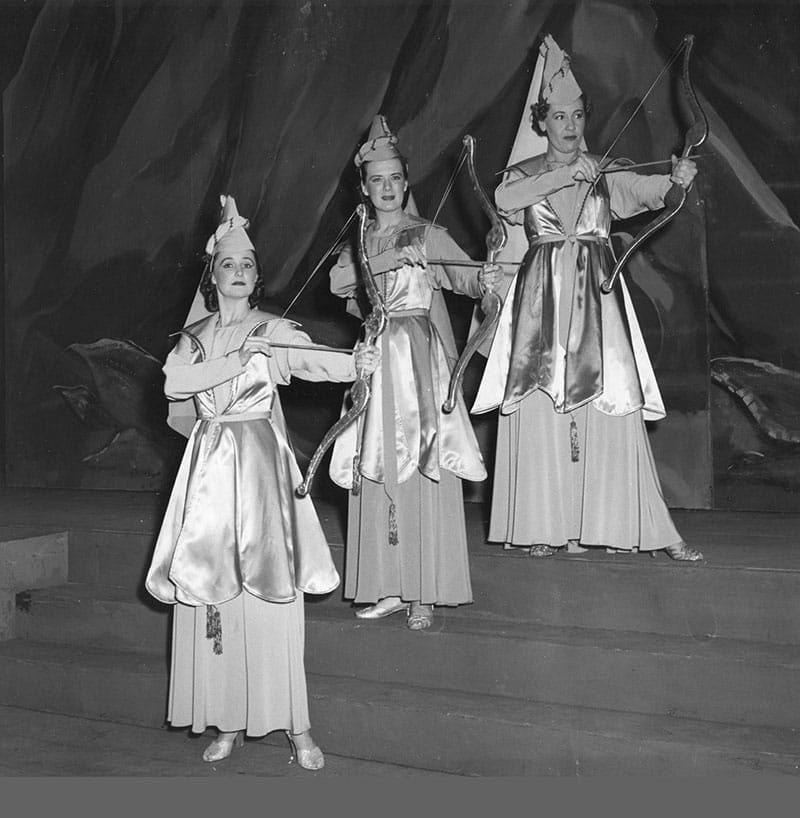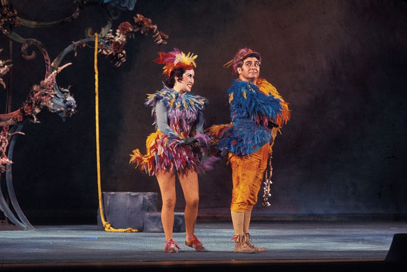 First: The Three Ladies (Renée Tatum, Lauren McNeese, Melody Moore) defend Tamino (Alek Shrader) from the serpent in the Kaneko production, 2012. / CORY WEAVER Second: Barbara Lauppe, Yvonne Chauveau, and Claramae Turner as the Three Ladies in the 1950 Company premiere. / STROHMEYER Third: Shigemi Matsumoto as Papagena and Geraint Evans as Papageno in the 1969 production, designed by Businger and Davis. / ROBERT CAHEN