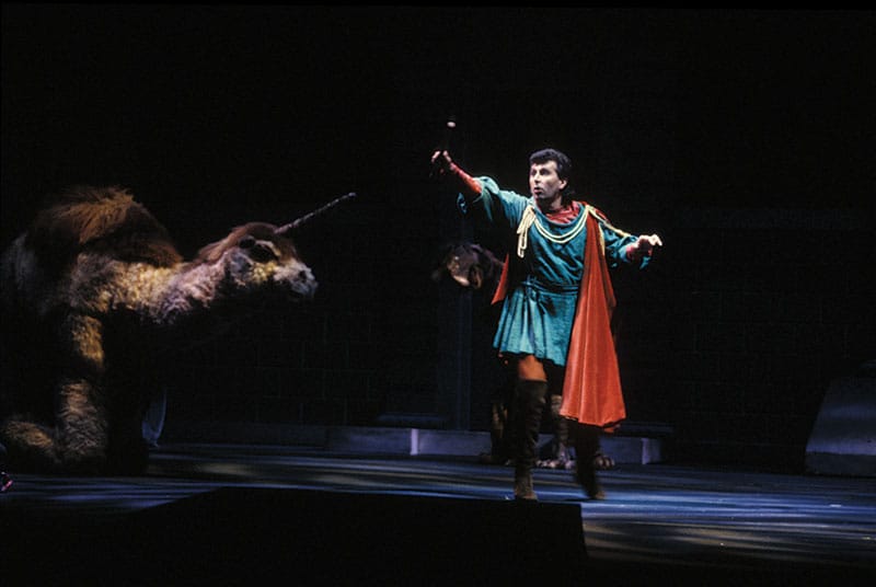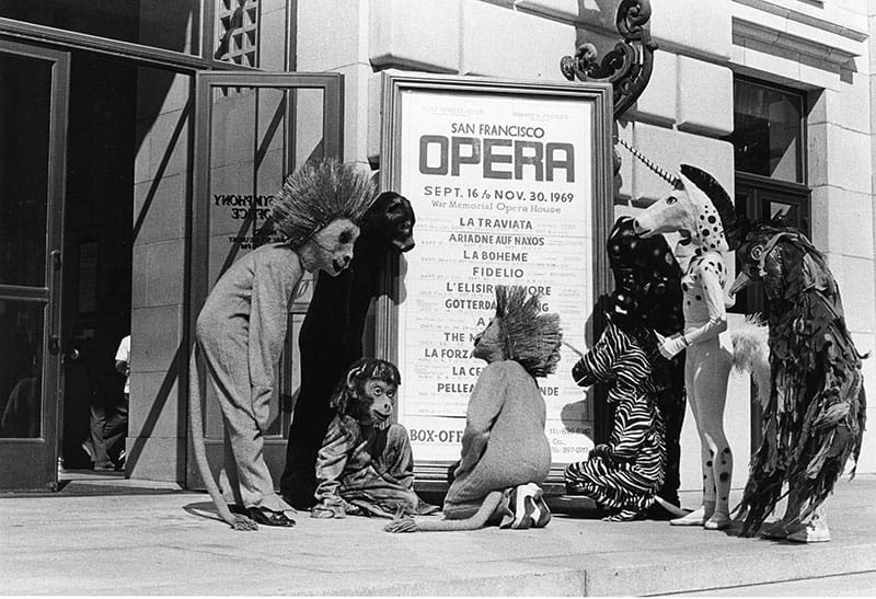 First: Paul Appleby as Tamino charms the animals designed by Jun Kaneko in 2015. / CORY WEAVER Second: The animals from The Magic Flute read about the Company’s 1969 season outside the Opera House. / MARGARET NORTON Third: The animals are serenaded by the Tamino of Jerry Hadley in the Hockney production, 1990. / ROBERT CAHEN