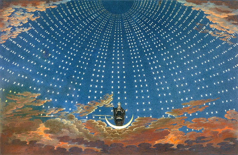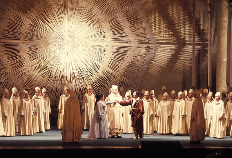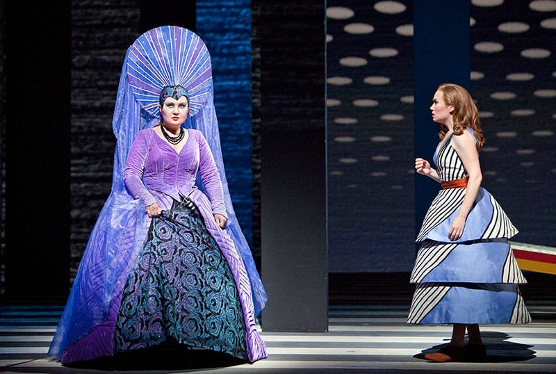 First: Marc Chagall’s iconic production arrived in 1980 with Barbara Carter as the Queen of the Night. / RON SCHERL Second: Albina Shagimuratova as the Queen of the Night in the production designed by Jun Kaneko, 2012. / CORY WEAVER Third: The opera’s finale in 1975, designed by Businger and West, featuring Margaret Price (Pamina), David Ward (Sarastro), and Stuart Burrows (Tamino). / ROBERT CAHEN
