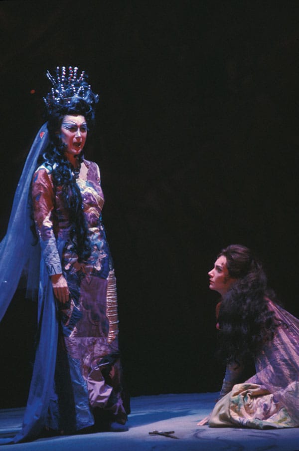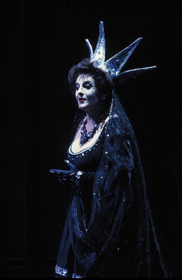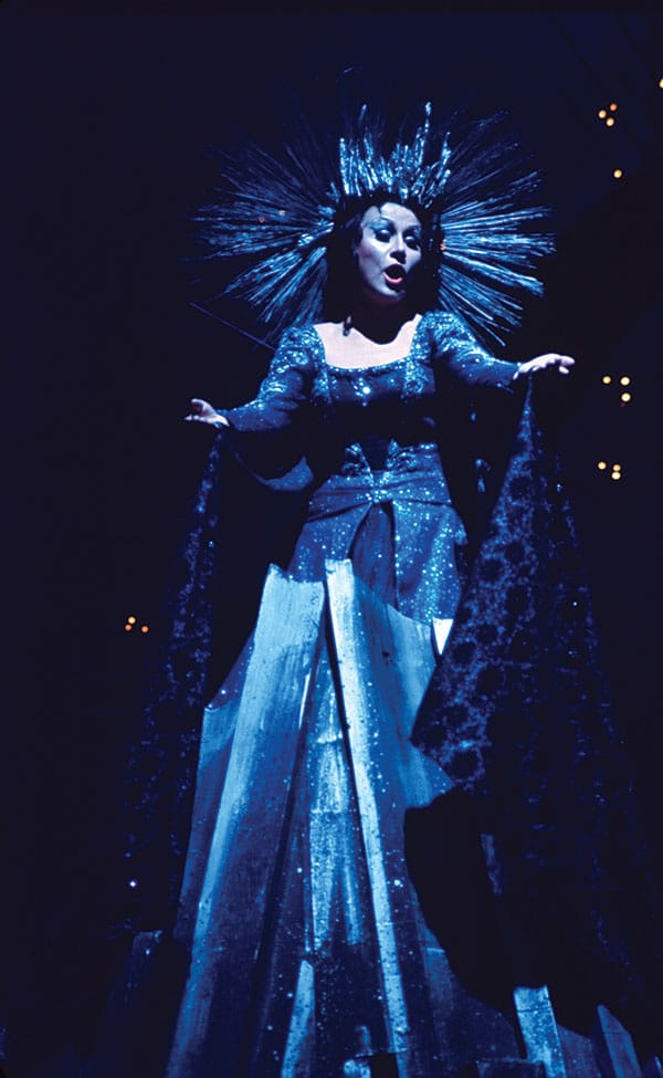 First: Act I scene for the Queen of the Night in 1967 by Company resident designer Davis L. West. / CAROLYN MASON JONES Second: Zdzislawa Donat in her 1975 American debut as the Queen of the Night, designed by Toni Businger. / GREG PETERSON Third: Sally Wolf as the Queen of the Night in the 1990 revival of the David Hockney production. / ROBERT CAHEN