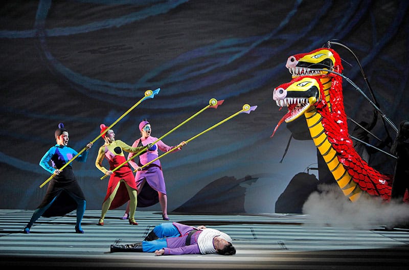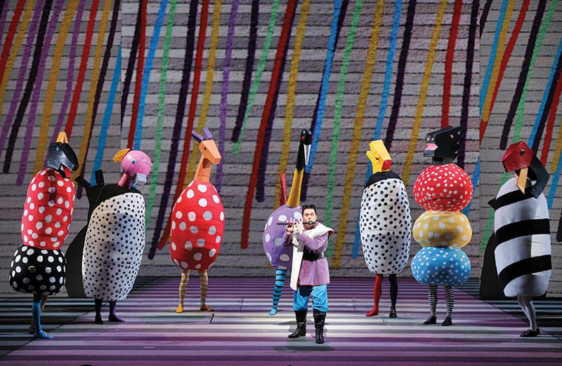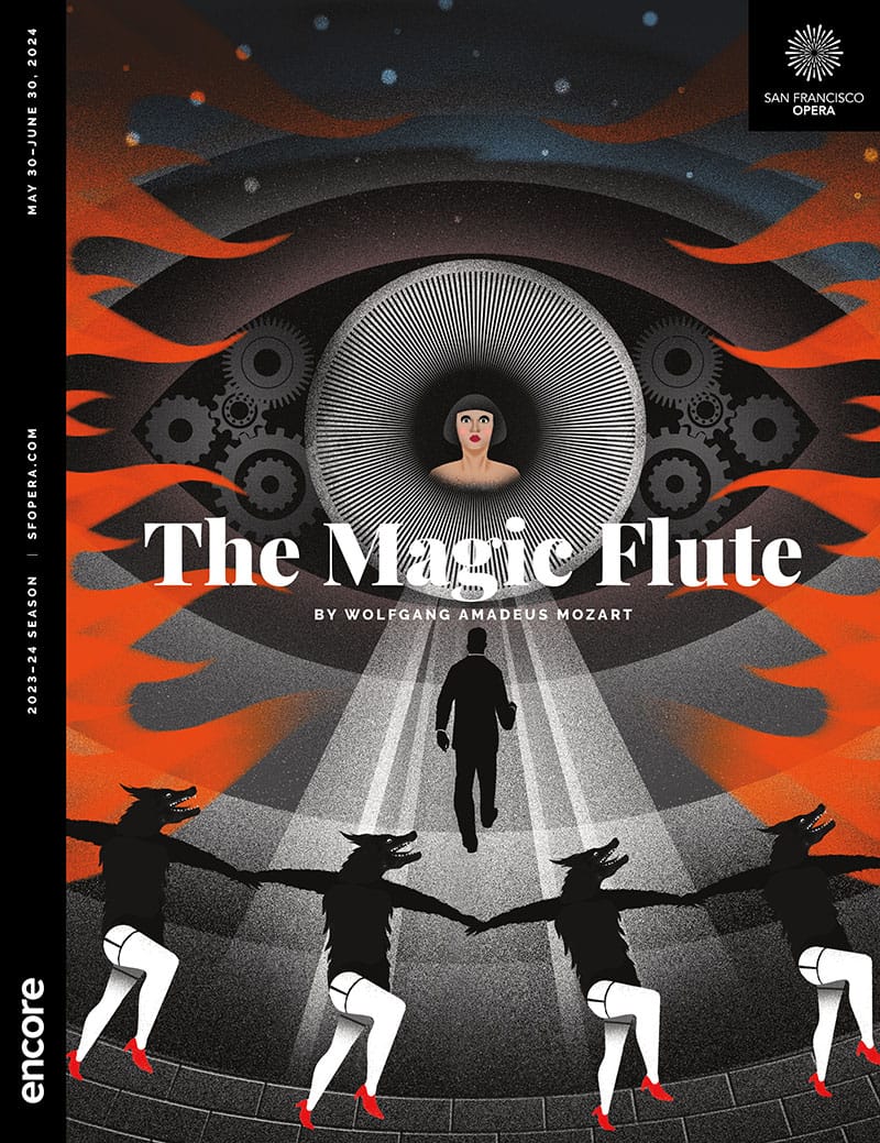 With its fairy-tale story and fantastical characters, The Magic Flute has long drawn creatives to the challenge of realizing its ideal representation on the stage. This season, Barrie Kosky and Suzanne Andrade’s production, with designs by Esther Bialas and animation by Paul Barritt, joins San Francisco Opera’s tradition (dating back to the 1950 Company premiere) for presenting Mozart’s masterpiece with imagination, verve, and joy. Below are a few snapshots, including the work of iconic artists Marc Chagall, David Hockney, and Jun Kaneko.
