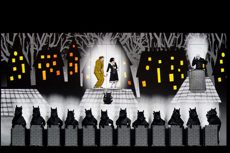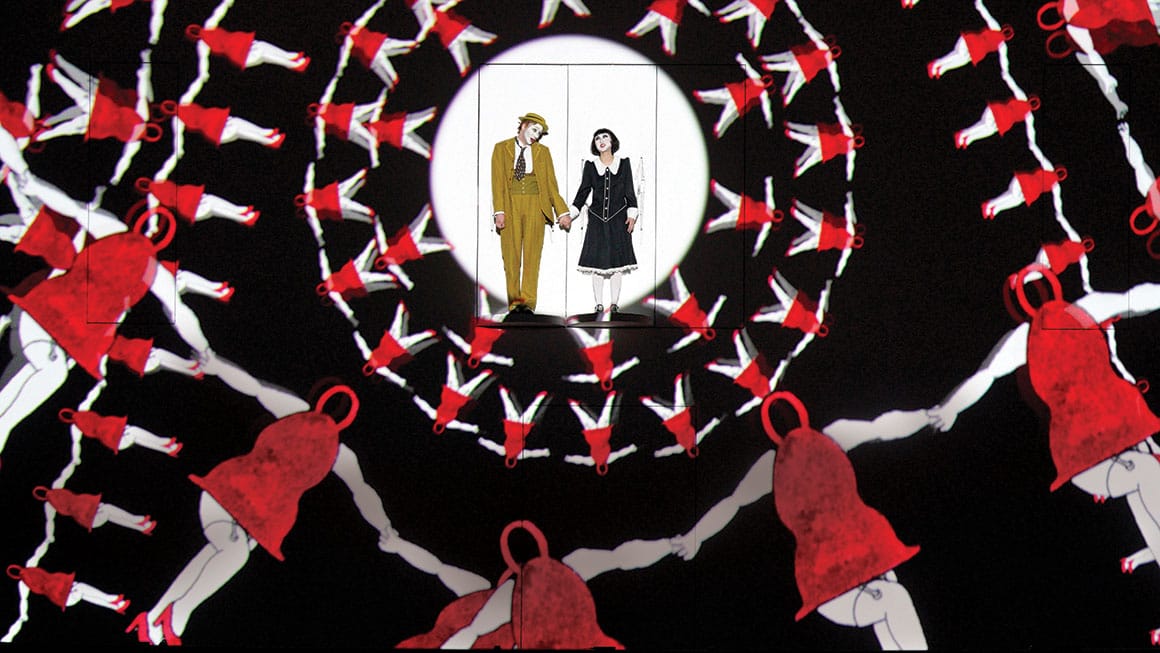 BK: This emphasis on the images makes it possible for every viewer to experience the show in his or her own way: as a magical, living storybook; as a curious, contemporary meditation on silent film; as a singing silent film; or as paintings come to life. Basically, we have a hundred stage sets in which things happen that normally aren’t possible onstage: flying elephants, flutes trailing notes, bells as showgirls … . We can fly up to the stars and then ride an elevator to hell, all within a few minutes. In addition to all the animation in our production, there are also moments when the singers are in a simple white spotlight and suddenly there’s only the music, the text, and the character. The very simplicity makes these perhaps the most touching moments of the evening. During the performance, the technology doesn’t play in the foreground. Although Paul spent hours and hours sitting in front of a computer to create it, his animation never loses its deeply human component. You can always see that a human hand has drawn everything. Video projections as part of theatrical productions aren’t new. But they often become boring after a few minutes, because there isn’t any interaction between the two-dimensional space of the screen and the three dimensions of the actors. Suzanne and Paul have solved this problem by combining all of these dimensions into a common theatrical language.