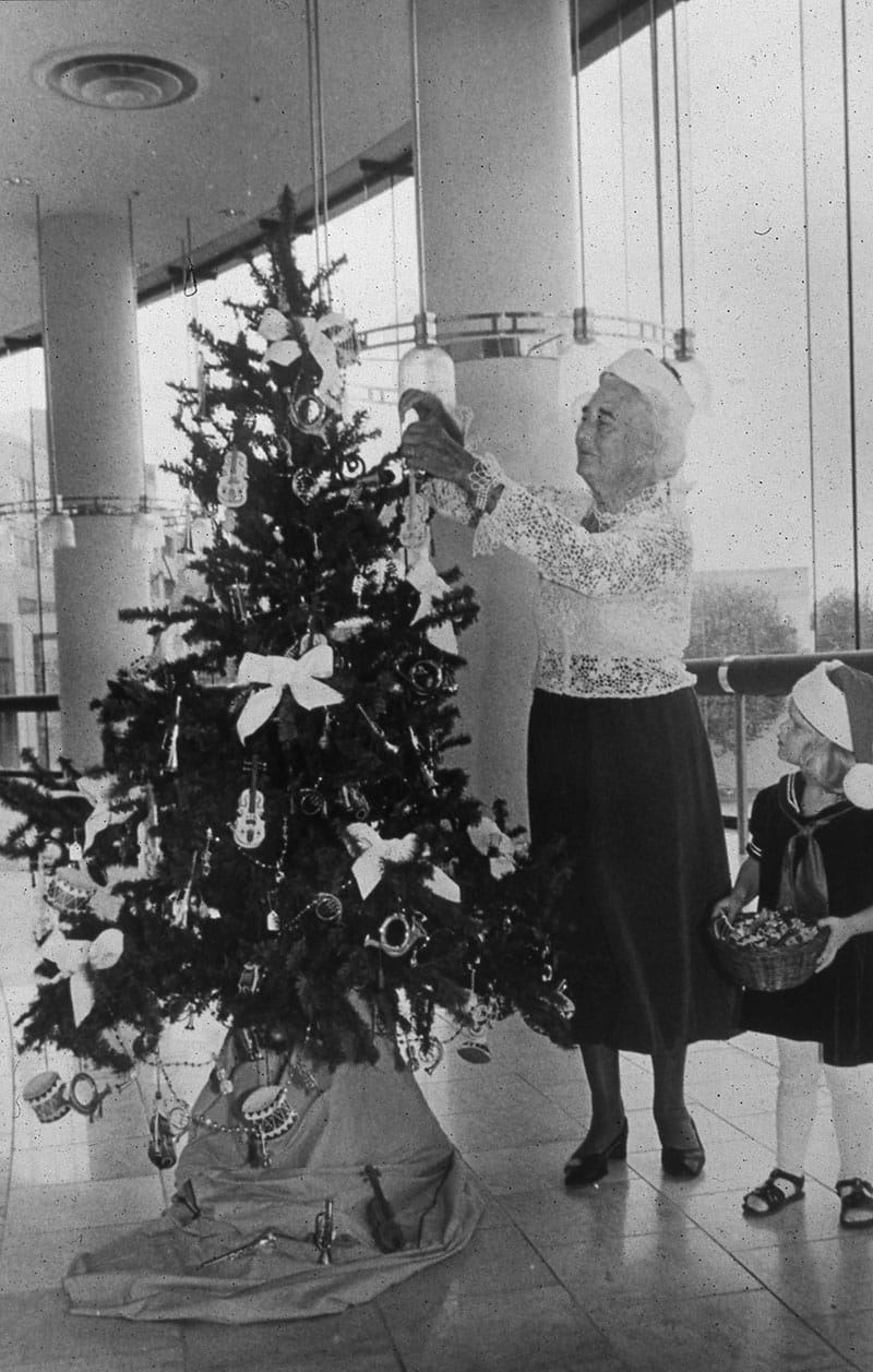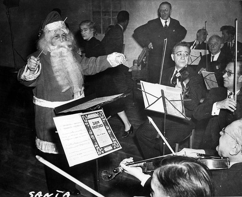 Prior to the construction of the War Memorial Opera House, and later Davies Symphony Hall, the Symphony delighted audiences with holiday concerts at venues throughout the Bay Area. This tradition began with the Symphony’s very first holiday concert, a December 1916 program for children at the Cort Theater. A particularly memorable performance came during World War II, when Music Director Pierre Monteux (in full Santa attire) led a holiday concert for soldiers stationed on Treasure Island.