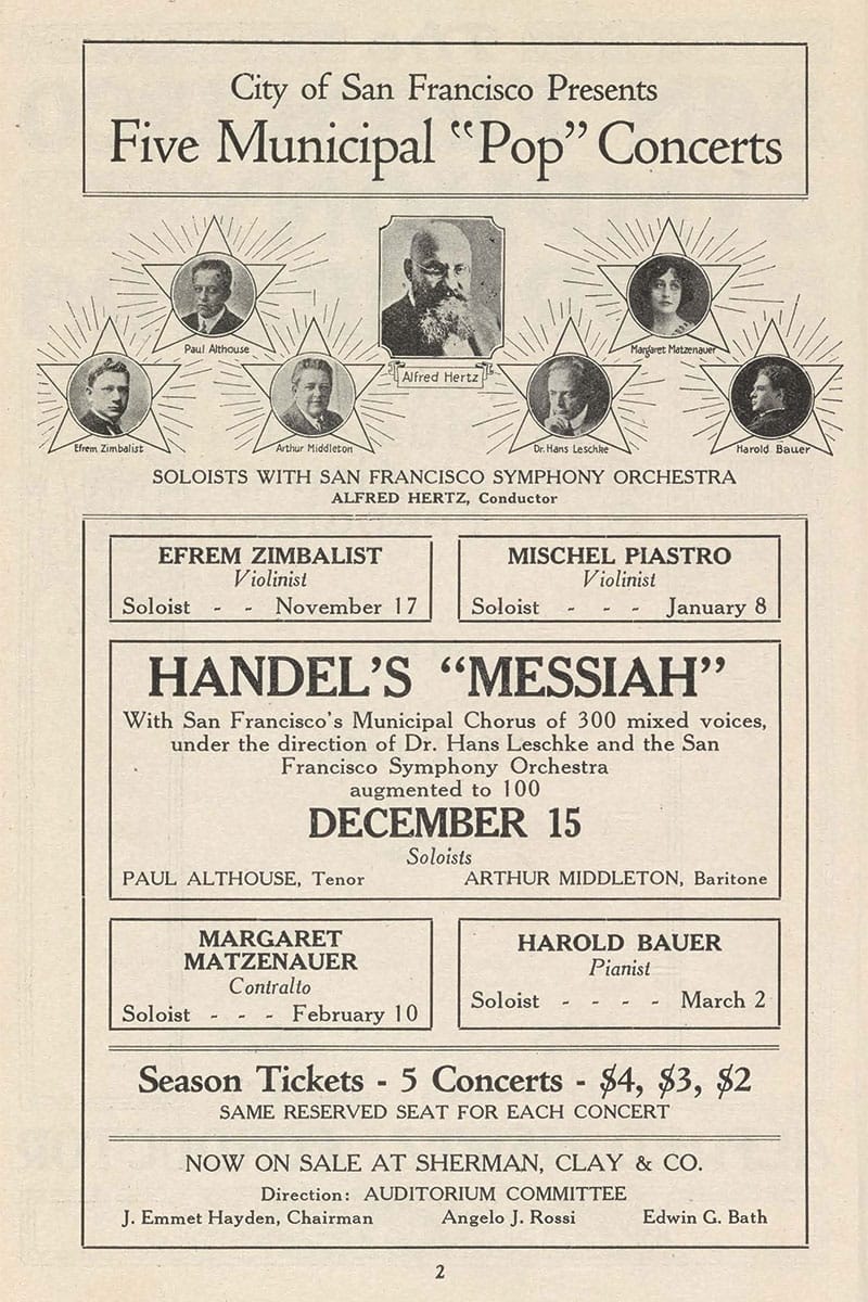 Alfred Hertz brought Handel’s Messiah to the San Francisco Symphony on December 15, 1925. The performance featured “San Francisco’s Municipal Chorus of 300 mixed voices under the direction of Dr. Hans Leschke and the San Francisco Symphony Orchestra augmented to 100.” Messiah made regular appearances over the years before becoming a nearly annual affair with the establishment of the San Francisco Symphony Chorus in the 1970s and the opening of Davies Symphony Hall in the early 1980s. Since then, performances have been led by early music specialists such as John Eliot Gardiner, Nicholas McGegan, Roger Norrington, Masaaki Suzuki, and Jane Glover, who conducts her fourth Messiah with the Symphony this month.