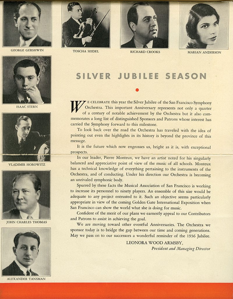 Following its successful 1924 premiere as part of conductor and impresario Paul Whiteman’s “Experiment in Music” concert at New York’s Aeolian Hall—Gershwin was piano soloist—Rhapsody in Blue made its way to the San Francisco Symphony in 1931. (Fun fact: Whiteman spent some time as a string player in the San Francisco Symphony in the 1910s before launching his career as a bandleader.)