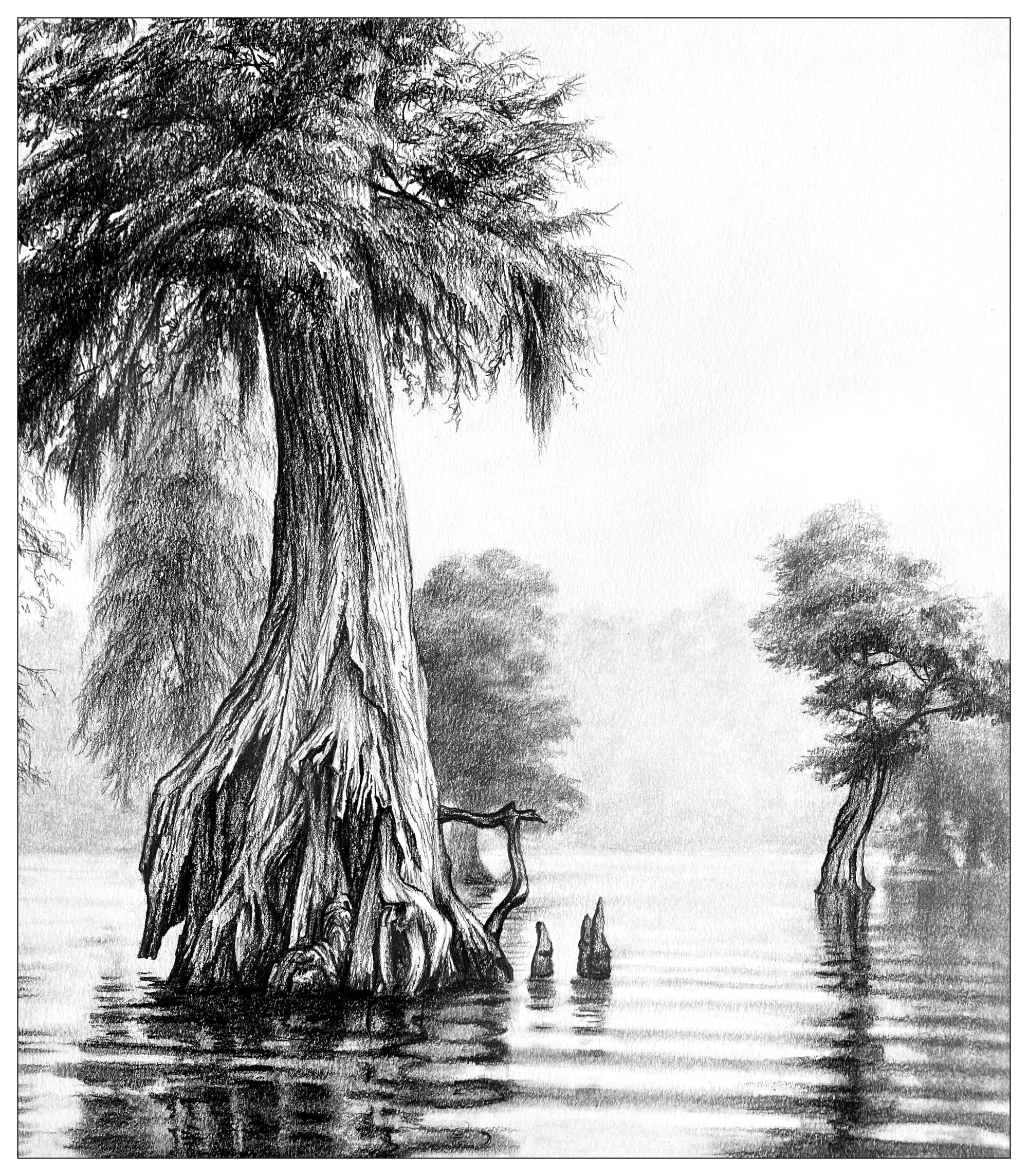 Kristin Frost’s drawings invite us to stop and contemplate the natural environment as a storyteller would. The precision of line, texture, and contrast, as well as negative space, somehow creates atmospheric impressions that pull the eye through the composition, giving snippets of story all along the way. Though her scenes are not in England or France where Agatha Christie’s stories like Murder on the Links take place, they do create a sense of place where Hercule Poirot and all of Christie’s other characters might exist. They hold “a banquet of clues” in much the same way as the crimes Poirot and Inspector Giraud solve. Kristin’s latest works with pops of color add to the delightful mysteries she draws with such skill.